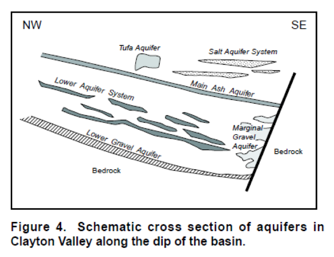 Dajin has retained the services of Reno, Nevada-based geothermal and mineral exploration geologist, Dr. Mark Coolbaugh, to carry out a structural and stratigraphic analysis of Teels Marsh. Using gravity, magnetic and Geoprobe data already collected, a new structural map of the basin is being created. The work is focused on identification of drill targets to test favourable aquifers that might contain Lithium-rich brines. Structural analysis reveals that Teels Marsh is bounded by faults and is tectonically active. Thick accumulations of ash deposits could occur beneath the marsh because the marsh occupies a closed basin and is located east of the nearby Long Valley Caldera (Bishop Tuff) and other ash producing volcanic centres. These ash layers have proven to be the most productive brine sources in Clayton Valley, where the only North American Lithium brine deposit is being mined by Albemarle Corporation. The following map is modified from the report of Zampirro, D., (2004) Hydrogeology of Clayton Valley Brine Deposits, Esmeralda County, Nevada, Nevada Bureau of Mines Special Publication 33, p. 271-280, (his Figure 11).