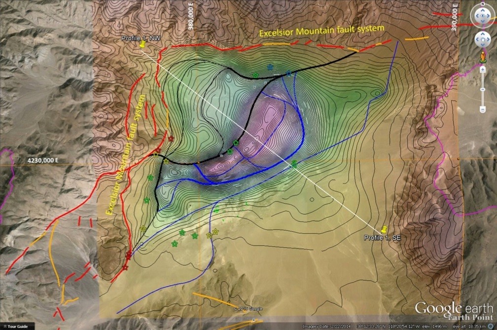 Structural model Teels Marsh: Model is superimposed on Google Earth with the bottom-of-basin elevation model. Excelsior Mountain fault system of Wesnousky (2005) shown in red (known) and orange (concealed). Faults inferred from the gravity-derived basin depth model of Wright (2015) shown in black (SE-dipping) and blue (NW dipping). Thin black lines are elevation contours on the modeled elevation of the unconsolidated sediment-basement contact (prior to modeling of fault locations). Transparent shading from yellow through green and lavender represents progressively lower elevations of the unconsolidated sediment-basement contact, with lowest elevations (lavender) lying 2 to 2.5 km (1.2 to 1.6 mi) below surface. Colored stars depict temperatures from springs, shallow wells, and direct-push holes drilled in 2010: green less than 20°C, yellow 20-26°C, orange 26-37°C, red >37°C. Cross-section is shown with white line (profile 1). A 10-km UTM wgs84 grid is shown with thin orange lines. Magenta lines on east and west margins of image mark the 812 km2 Teels Marsh surface catchment basin.
