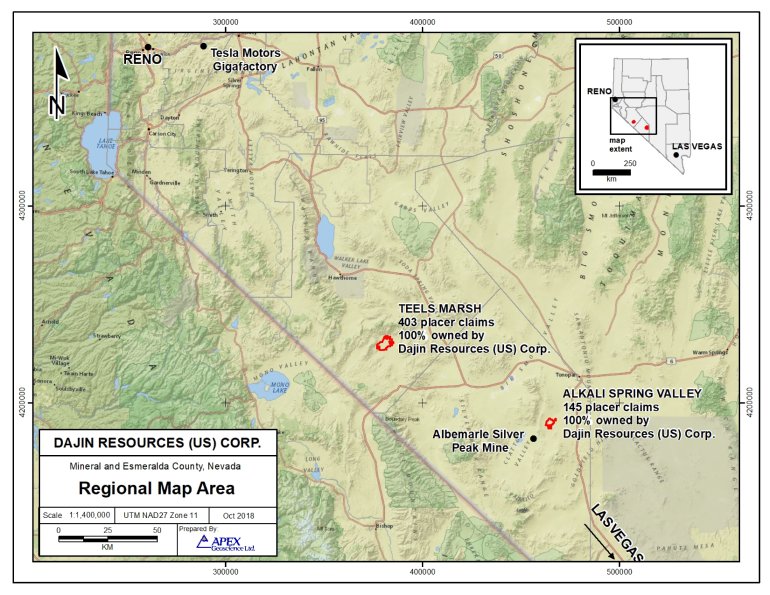 In early February 2018, Dajin began to move forward with construction of the engineered roads and drill pads at Teels Marsh valley in preparation for the drilling of four (4) production sized exploration wells. Dajin has executed a Service Agreement with Welsh Hagen Associates, Inc. located in Reno, Nevada. Welsh Hagen (formerly Telesto Nevada, Inc.) has been providing design and construction services to the Nevada exploration and mining community since 2003. Gravel was being processed for road construction and drill pads from a nearby private land parcel. The roads provide all-season access to the drilling pads where Dajin will drill four (4) exploration holes. Dajin’s exploration approach is significantly different than what other companies have undertaken in Nevada. These wells will be drilled at a large diameter using rotary drilling techniques. In addition, because Dajin holds water rights in Teels Marsh valley, has received from the Nevada Division of Water Resources (State Engineer), approval for pump-test volumes up to 20 acre-feet per well. The drilling of deep, large-diameter, cased wells with the ability to discharge, will make it possible to not only measure the concentration of Lithium in the subsurface aquifers but to also carry out the flow testing of any Lithium bearing subsurface aquifers that may be encountered during the drilling.