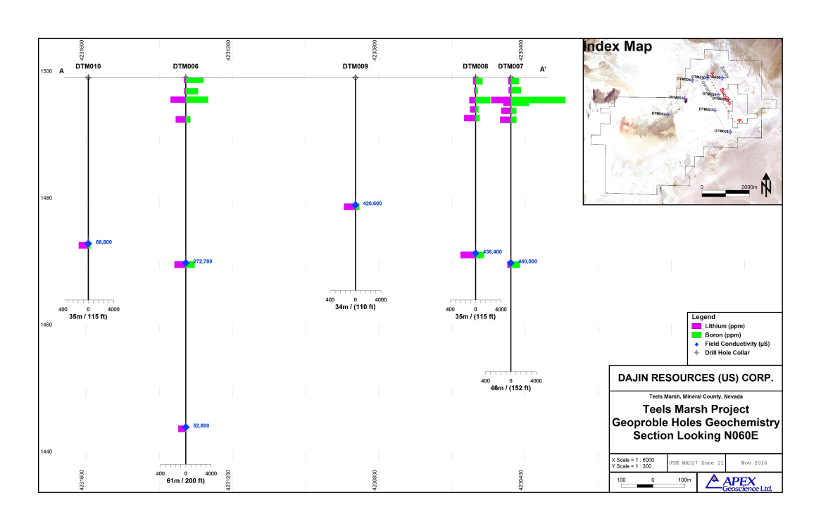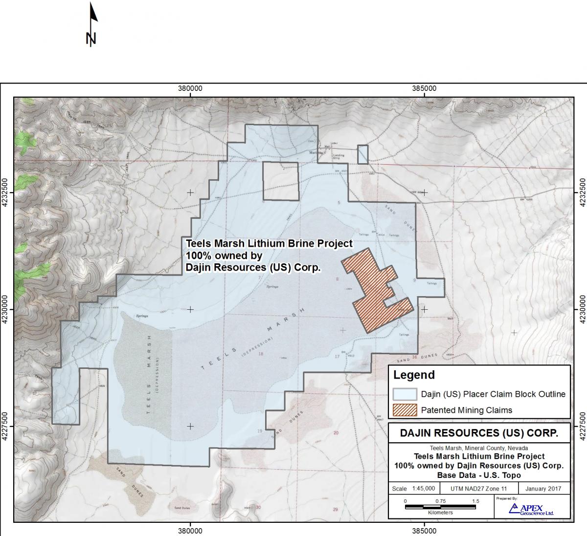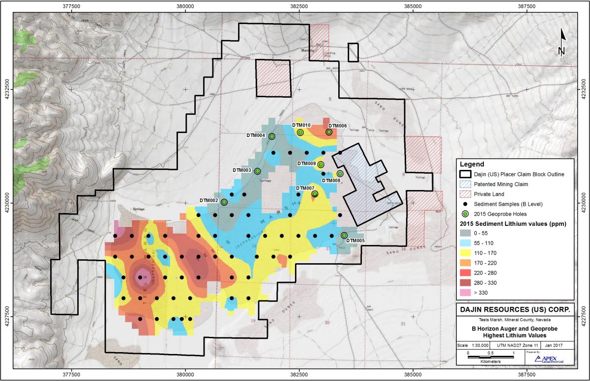 In February 2015 Dajin confirmed the Lithium potential of Teels Marsh. Dajin has received the Lithium and Boron assay results from a widely spaced sediment sampling program carried out on Dajin’s 100% owned Teels Marsh claims in Mineral County, Nevada. The results of the initial exploration program confirmed the presence of near surface Lithium in dry and wet sediments within an anomalous zone up to 18,000 feet long in an east-west direction and up to 6,000 feet wide in a north-south direction (5480 m x 1820 m). A total of 74 sample locations were tested, at approximately 1,000 feet (300 m) intervals along east-west lines 1,600 feet (487 m) apart. With most of the analyses completed, the highest Lithium assay value was 460 ppm. There were 28 assays that returned Lithium values greater than 150 ppm, 23 assays were greater than 100 ppm and only 5 assays were lower than 100 ppm.