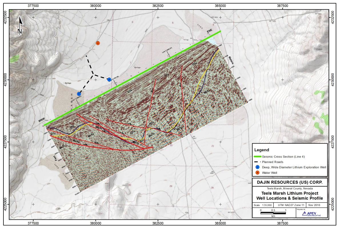 Planned Well Locations and Seismic Profile at Dajin's Teels Marsh Lithium Project
