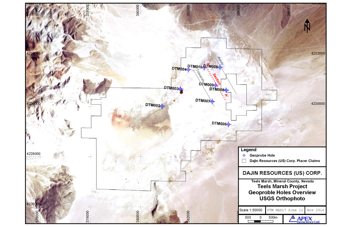 Dajin retained Pediment Gold LLC, of Sparks, Nevada to carry out the exploration work on Teels Marsh. Pediment Gold LLC has significant experience in geoprobe sampling of Nevada playas to obtain fluid and sediment samples. This exploratory work was designed to help determine if shallow (less than 200 feet (60 meters)) brine deposits exist and to determine the subsurface properties of the marsh in preparation for deep drilling. A recent rain event had left the Marsh surface wet and restricted access to the margins and northern parts of the claim block. The crew was able to complete 9 holes, the deepest of which was 195 feet (59 meters). In addition to the deep probe samples to collect fluid and sediment, 3 25 foot (7.5 meter) were also collected. Sediments will be analyzed for their physical properties, composition and Lithium concentrations. Collected fluids will be analyzed for a suite of chemicals, including Boron and Lithium.