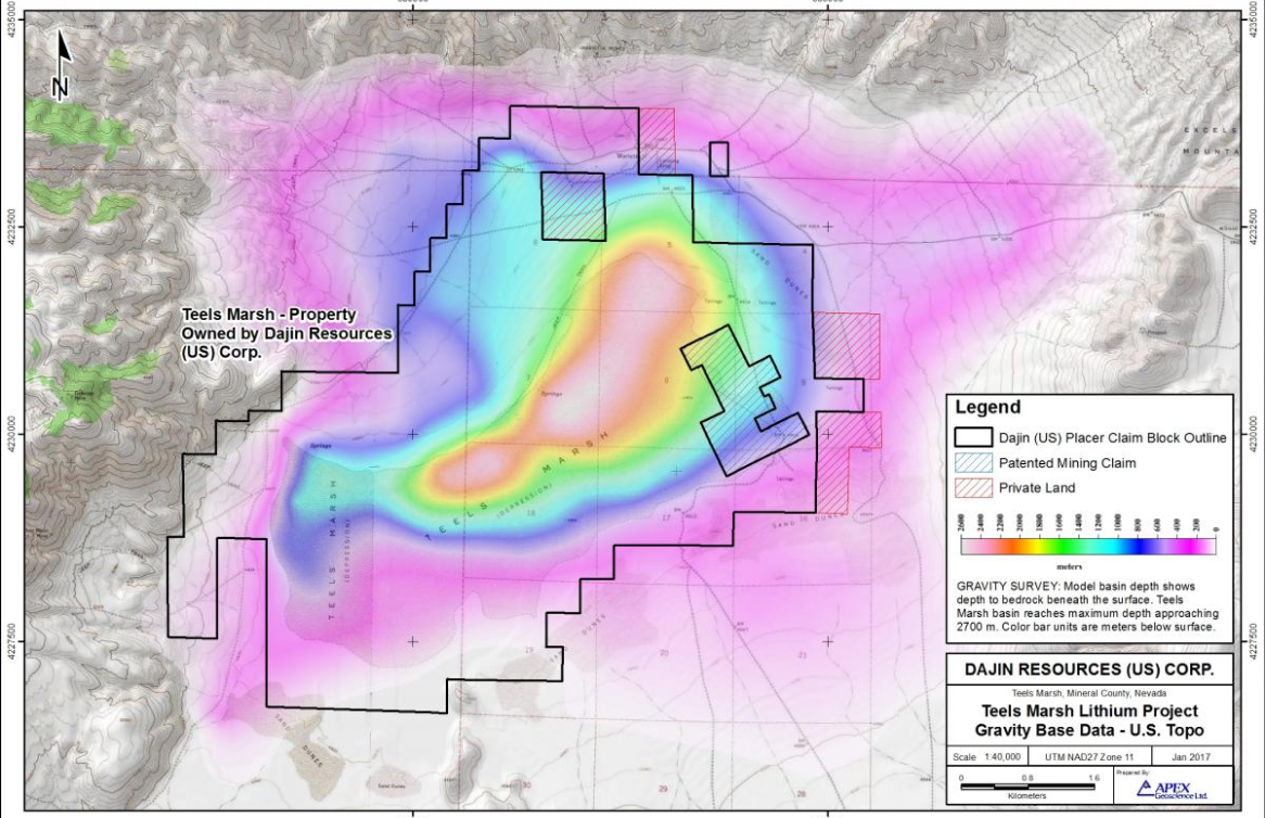 D2 LITHIUM has been carrying out exploration at Teels Marsh since late 2014. The initial work in the marsh was auger drilling to sample near-surface brines and confirm the presence of Lithium in sediments reported from surveys in the 1970s. Following auger drilling, a detailed gravity survey was completed and a basin depth model was generated. This model revealed that the sediment basin underneath Teels Marsh was steep-sided and more than 2 km deep. The company then completed a 10-hole Geoprobe survey of the northeastern section of the marsh. In addition, Dajin completed a structural analysis in early 2016 and a 12 mile (19 km) seismic survey was carried out during May-June 2016. In May 2016, Dajin announced the acquisition of water rights for Teels Marsh through the Nevada Division of Water Resources (NDWR). On September 15, 2016, Dajin reported that the processing and interpretation of the high resolution seismic survey carried out in May and June was completed. Dajin Director, Dr. Mark Coolbaugh, in conjunction with the University of Nevada, Reno, completed the analysis of the data and created an updated structural interpretation of the playa. Dajin is planning to drill wide diameter exploration wells at two sites: one site is located in the sub-basin at the west end of Teels Marsh, where Lithium concentrations in shallow brines sampled by augers ranges from 0.2 to 71 ppm. A second site is more centrally located above the deepest part of the basin. Dajin's geophysical and geological analysis has confirmed that the playa is over 6,500 feet (2,000 m) deep; deeper than most playas of its size in Nevada. This great depth has led Dajin to plan for wells deeper than those contemplated at other playas (≥2,000 feet), but consistent with known production depths at Clayton Valley's Albemarle's Silver Peak Lithium Brine Mine. A shallower well will be drilled alongside a deeper well at each site. This will facilitate sampling of potential Lithium-rich aquifers at a variety of depths. The wells are also designed to penetrate a number of strong reflectors seen in the seismic survey. These reflectors likely indicate interstratified accumulations of volcanic ash, sands, gravels, evaporites and other types of sedimentary deposits, and some of these layers could host the sought-after Lithium-enriched brines.