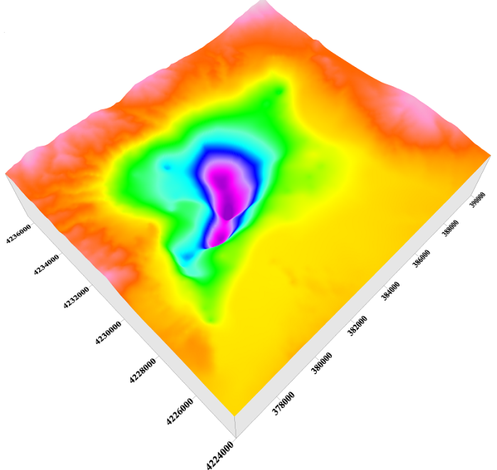 The figure represents the three dimensional shape of the basin if all the sediments were removed. The colour bands characterize depth with the bottom of the basin modeled as deep as 8,900 foot (2,700 meters)