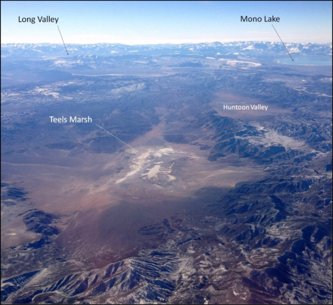 Teels Marsh is a dry lake very similar to the Clayton Valley property, being that they are both closed desert basins (playas) that were mined for borax starting in the mid 1800’s. The areas covered by pediment include areas where sand and gravel have been periodically flushed into the margins of the playa, originally a much deeper basin, by the larger drainages into the playa. Subsequent flooding by Lithium and Boron rich waters trapped in the basin would form brines by evaporation and the sand and gravel beds would become brine rich aquifers in the package of basin sediments.