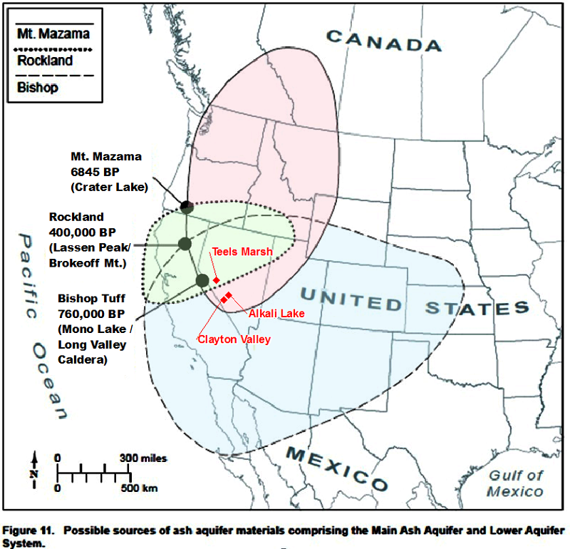 Dajin has retained the services of Reno, Nevada-based geothermal and mineral exploration geologist, Dr. Mark Coolbaugh, to carry out a structural and stratigraphic analysis of Teels Marsh. Using gravity, magnetic and Geoprobe data already collected, a new structural map of the basin is being created. The work is focused on identification of drill targets to test favourable aquifers that might contain Lithium-rich brines. Structural analysis reveals that Teels Marsh is bounded by faults and is tectonically active. Thick accumulations of ash deposits could occur beneath the marsh because the marsh occupies a closed basin and is located east of the nearby Long Valley Caldera (Bishop Tuff) and other ash producing volcanic centres. These ash layers have proven to be the most productive brine sources in Clayton Valley, where the only North American Lithium brine deposit is being mined by Albemarle Corporation. The following map is modified from the report of Zampirro, D., (2004) Hydrogeology of Clayton Valley Brine Deposits, Esmeralda County, Nevada, Nevada Bureau of Mines Special Publication 33, p. 271-280, (his Figure 11).