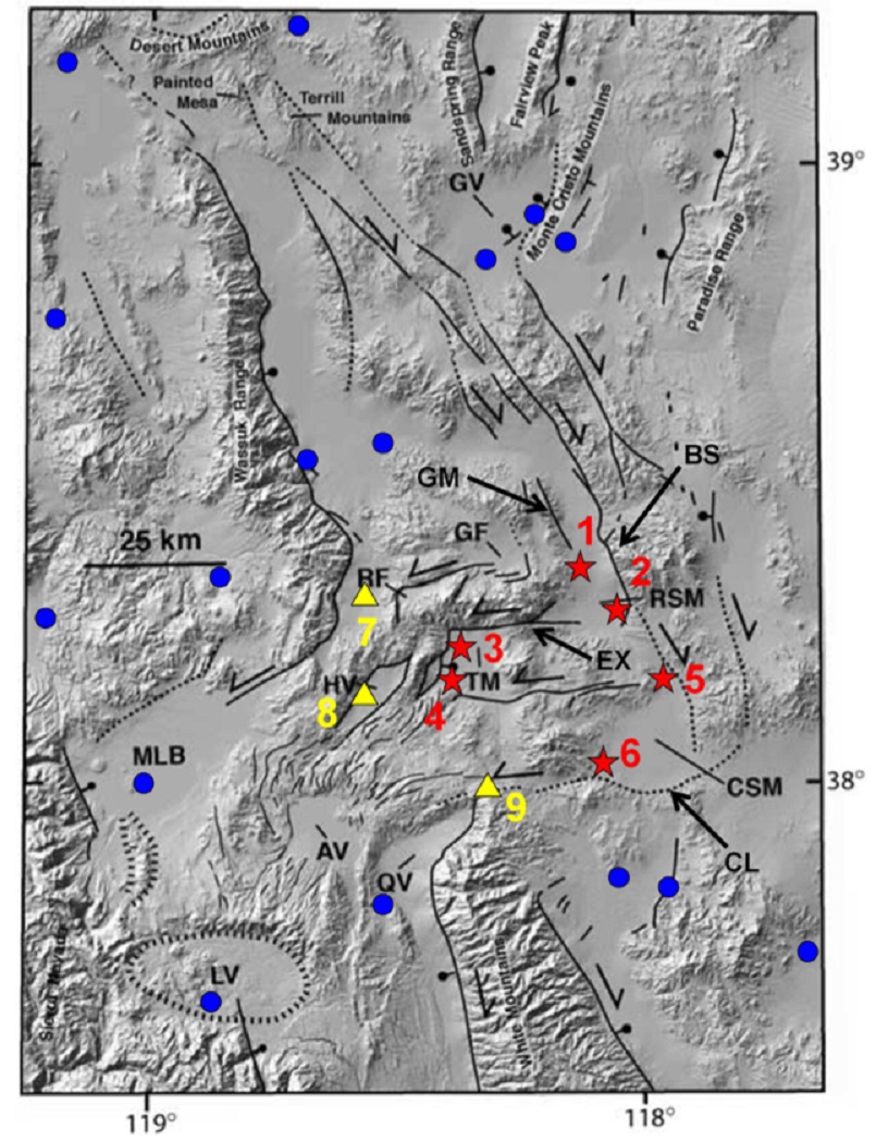 Regional structural setting: Quaternary faults and geothermal systems in the Mina Deflection, taken from Coolbaugh et al. (2005) and originally adapted from Wesnousky (2005). The physical extent of the Mina Deflection encompasses the geothermal areas: 1 = Sodaville, 2 = Rhodes Marsh, 3 & 4 = North & south Teels Marsh, 5 = Redlich, 6 = SW Columbus Marsh; and thermal wells 7, 8, and 9 at Whiskey Flat, Huntoon Valley, and NE of Queen Valley, respectively. RSM = Rhodes Salt Marsh, TM = Teels Marsh, CSM = Columbus Salt Marsh, GF = Garfield Flat, HV = Huntoon Valley, RF = Rattlesnake Flat, MLB = Mono Lake Basin, LV = Long Valley caldera, AV = Adobe Valley, QV = Queen Valley, GV = Gabbs Valley, EX = Excelsior Mountain fault, GM = Gumdrop Hills fault, CL = Coaldale fault, BS = Benton Springs fault. Blue circles are geothermal systems outside the Mina Deflection with measured or estimated temperatures >70°C.